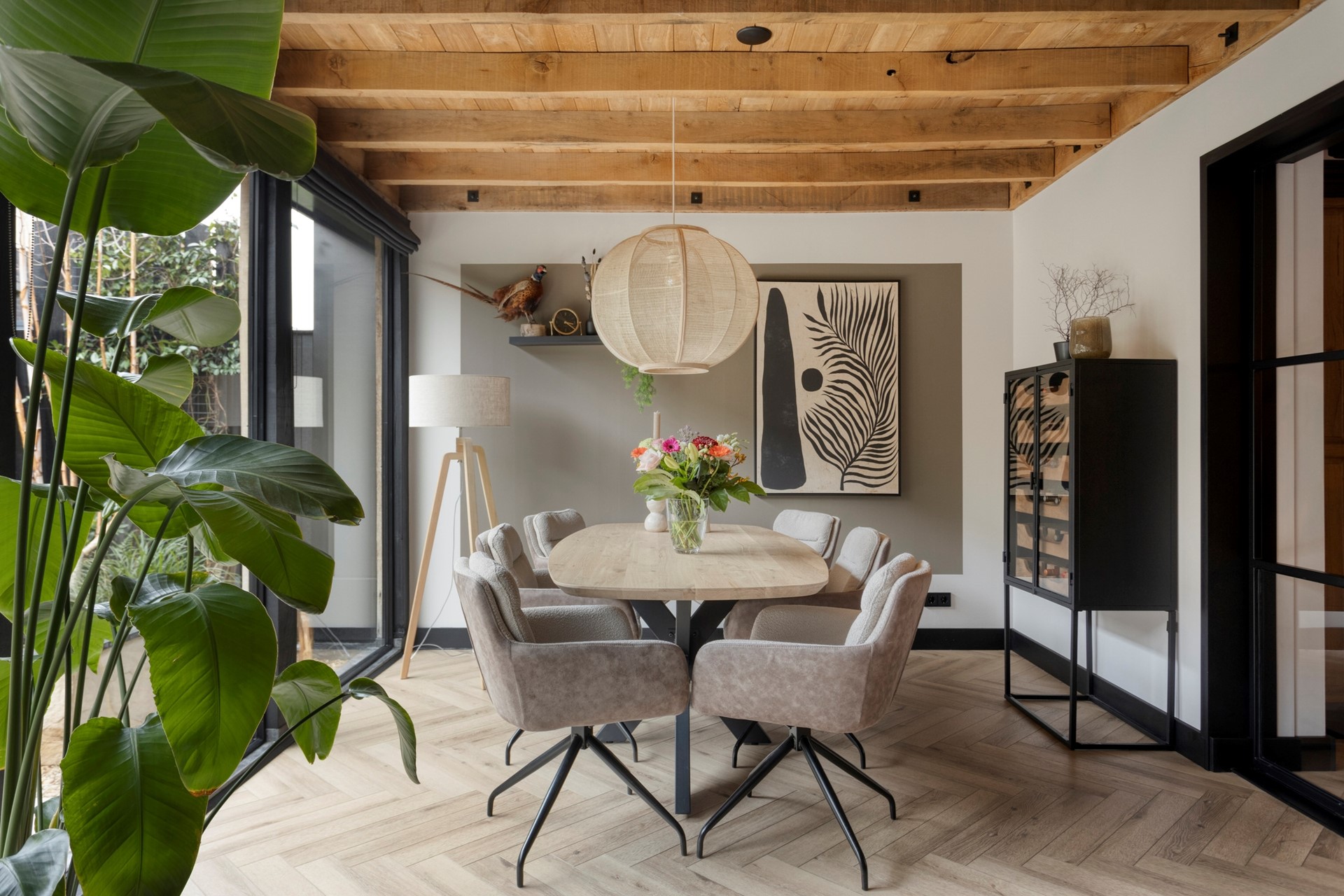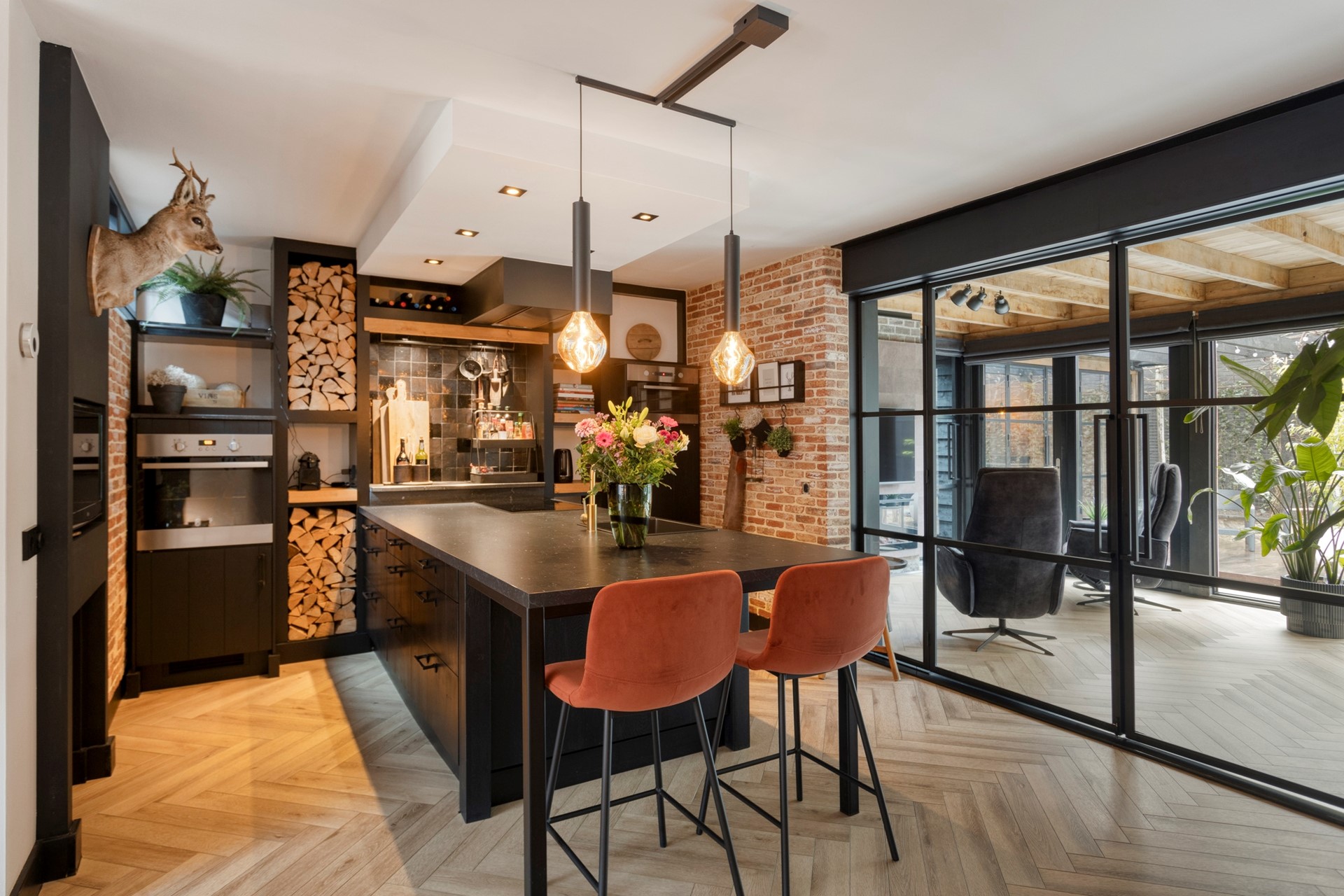 De entree biedt toegang tot de indrukwekkende woonkamer en eetkamer (samen ca. 11 meter diep). De woonkamer aan de voorzijde staat in open verbinding met de moderne keuken, die is opgesteld rondom een praktisch kookeiland. De aangrenzende eetkamer biedt dankzij de grote glazen pui een prachtig uitzicht op en toegang tot de buitenruimte.