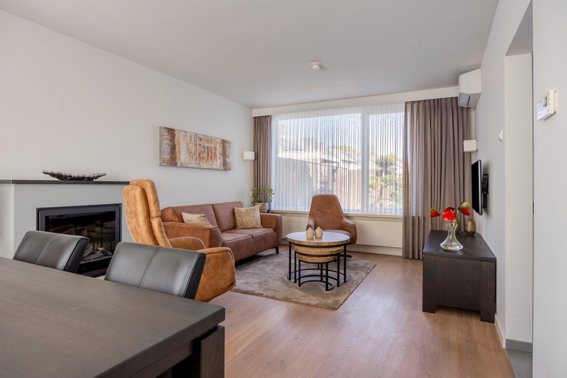 Bij binnenkomst in de hal treft u het moderne zwevende toilet met fonteintje en de in 2021 vernieuwde meterkast. De sfeervolle woonkamer is voorzien van een prachtige parketvloer en een gezellige elektrische haard. Dankzij de airconditioning (2021) geniet u hier het hele jaar door van een optimaal klimaat.