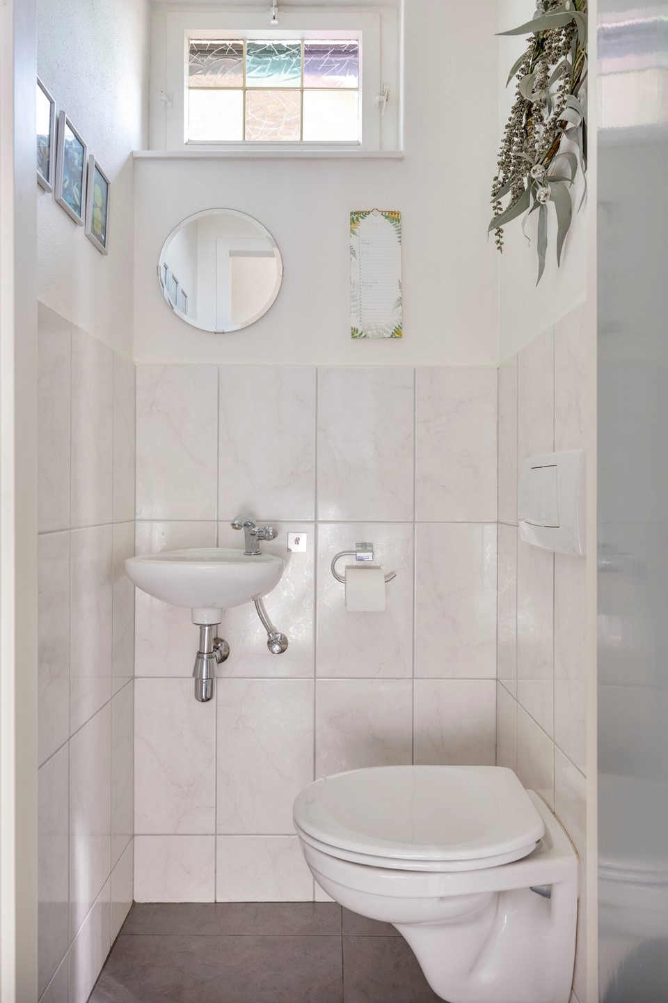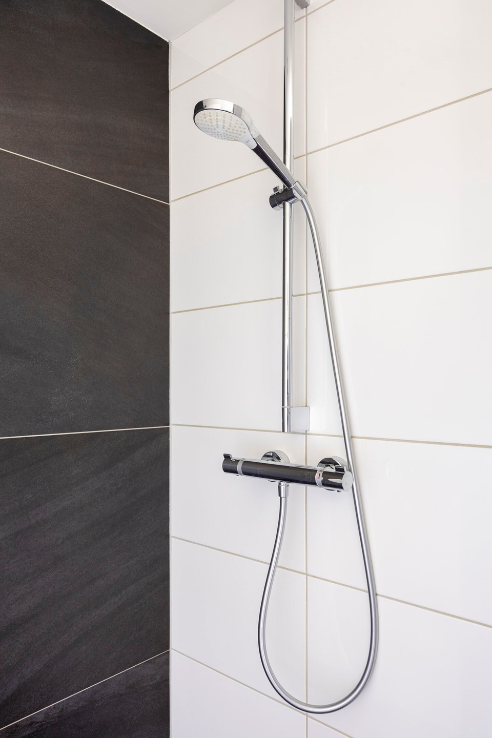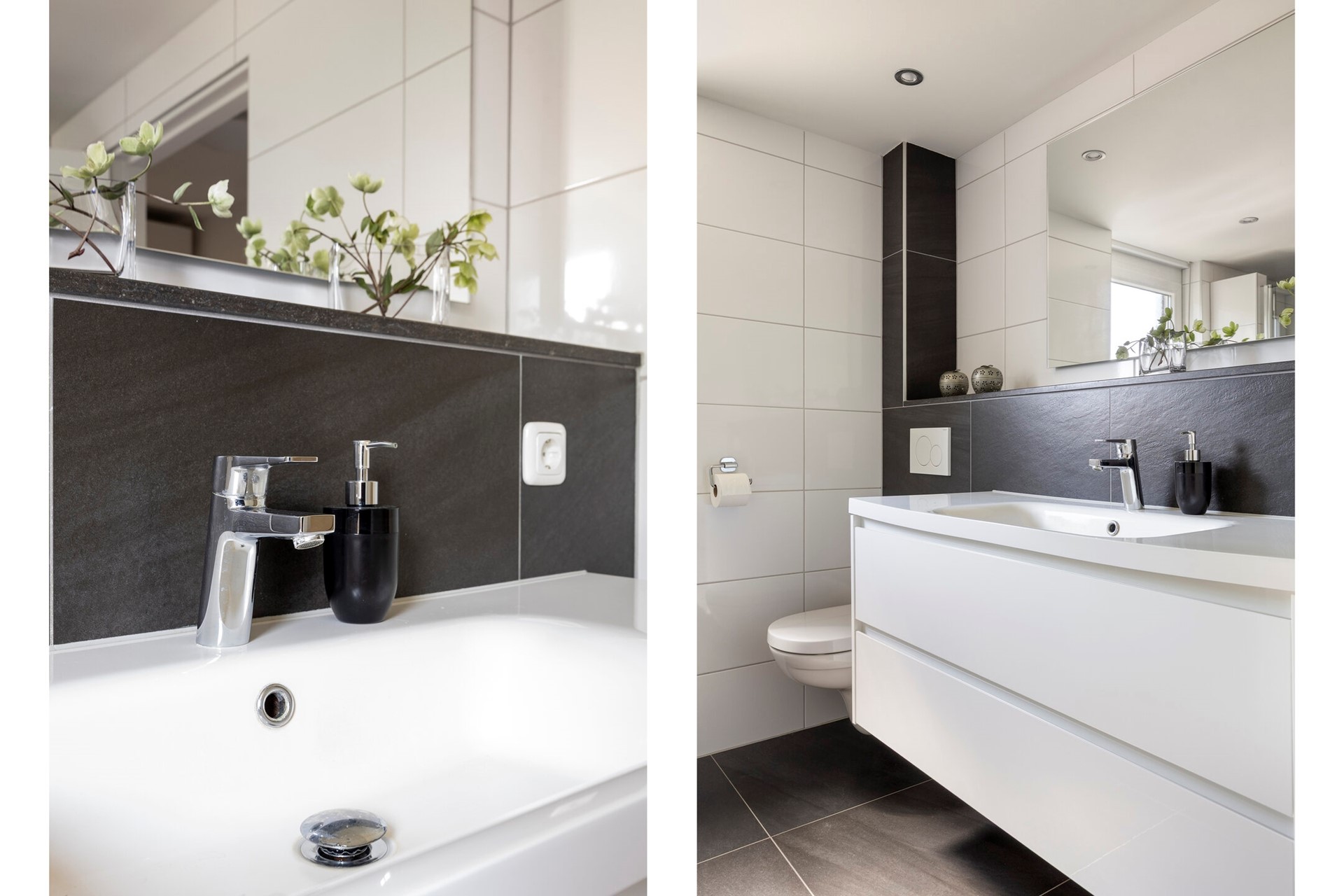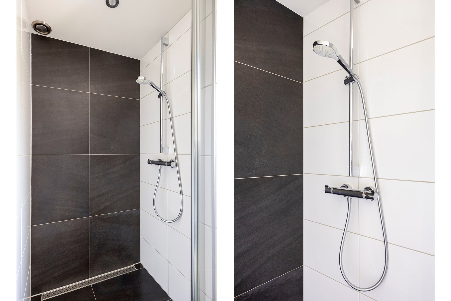 De badkamer is modern afgewerkt en uitgerust met een ruime inloopdouche, een tweede zwevend toilet en een wastafelmeubel.