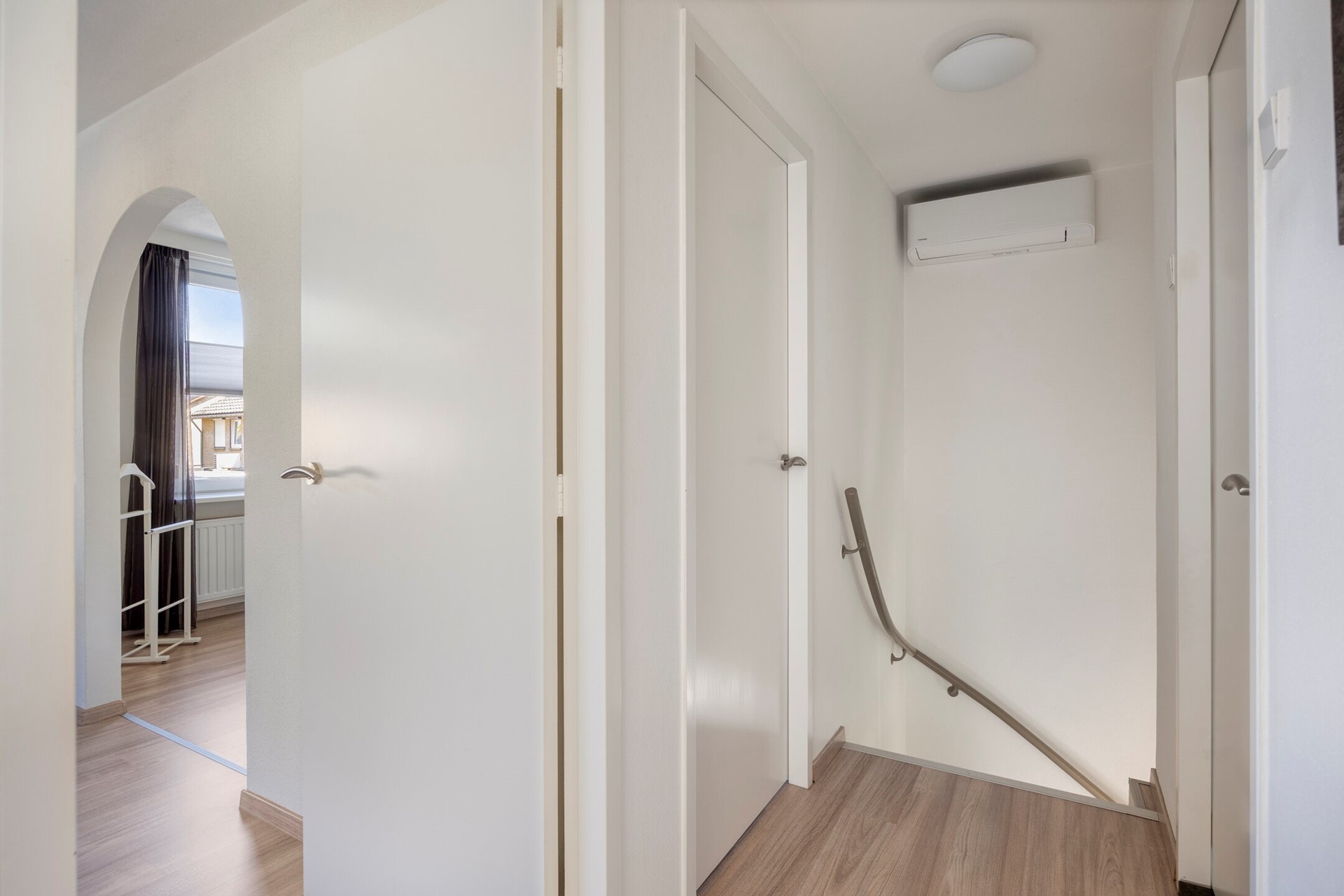 De gerenoveerde en beklede trap (2020) leidt naar de overloop met een moderne laminaatvloer. Hier bevinden zich momenteel twee zeer ruime slaapkamers. De master-bedroom is samengevoegd met de derde slaapkamer, waardoor er een royale kledingkamer/walk-in closet is ontstaan. Wenst u toch drie slaapkamers? Met het plaatsen van een eenvoudige tussenwand is de oorspronkelijke indeling direct hersteld. Ook deze verdieping is voorzien van airconditioning (2019).