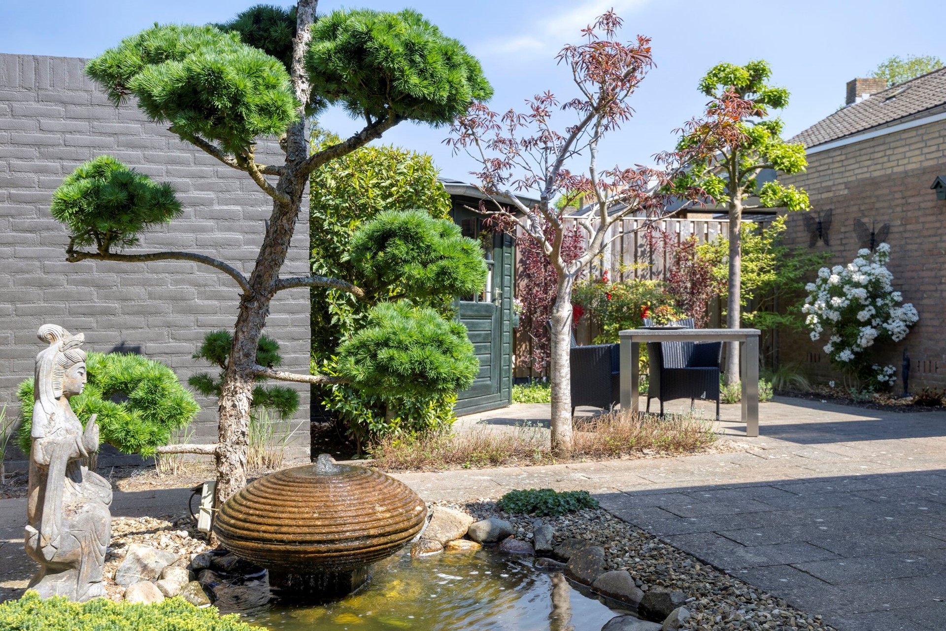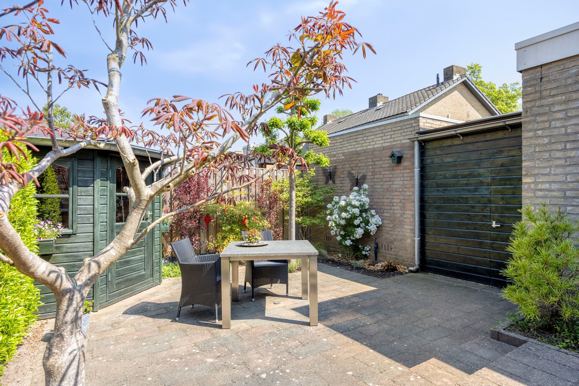 De woning beschikt over een keurig aangelegde voor- en achtertuin. De voortuin is op het zonnige zuiden gelegen, terwijl de achtertuin (noord) altijd een fijn plekje in de schaduw en in de namiddag in de zon biedt. Uw auto’s parkeert u gemakkelijk op de eigen oprit (ruimte voor 2 auto's). De garage is voorzien van een grindvloer, water, elektra en aansluitingen voor het witgoed.