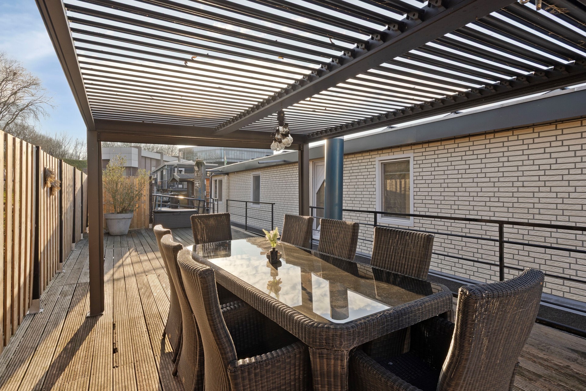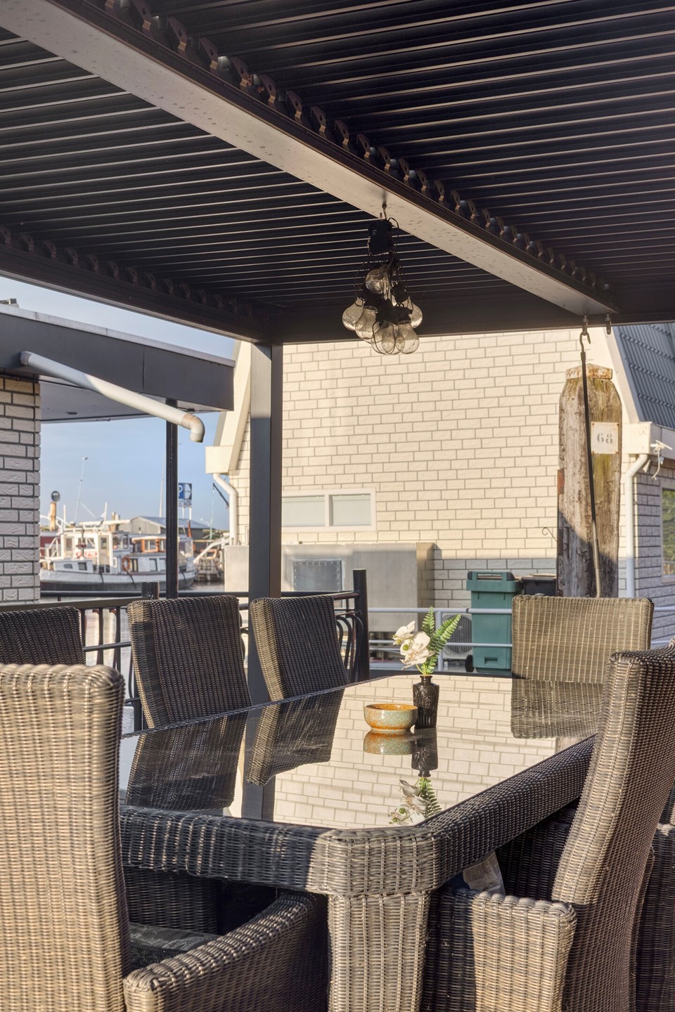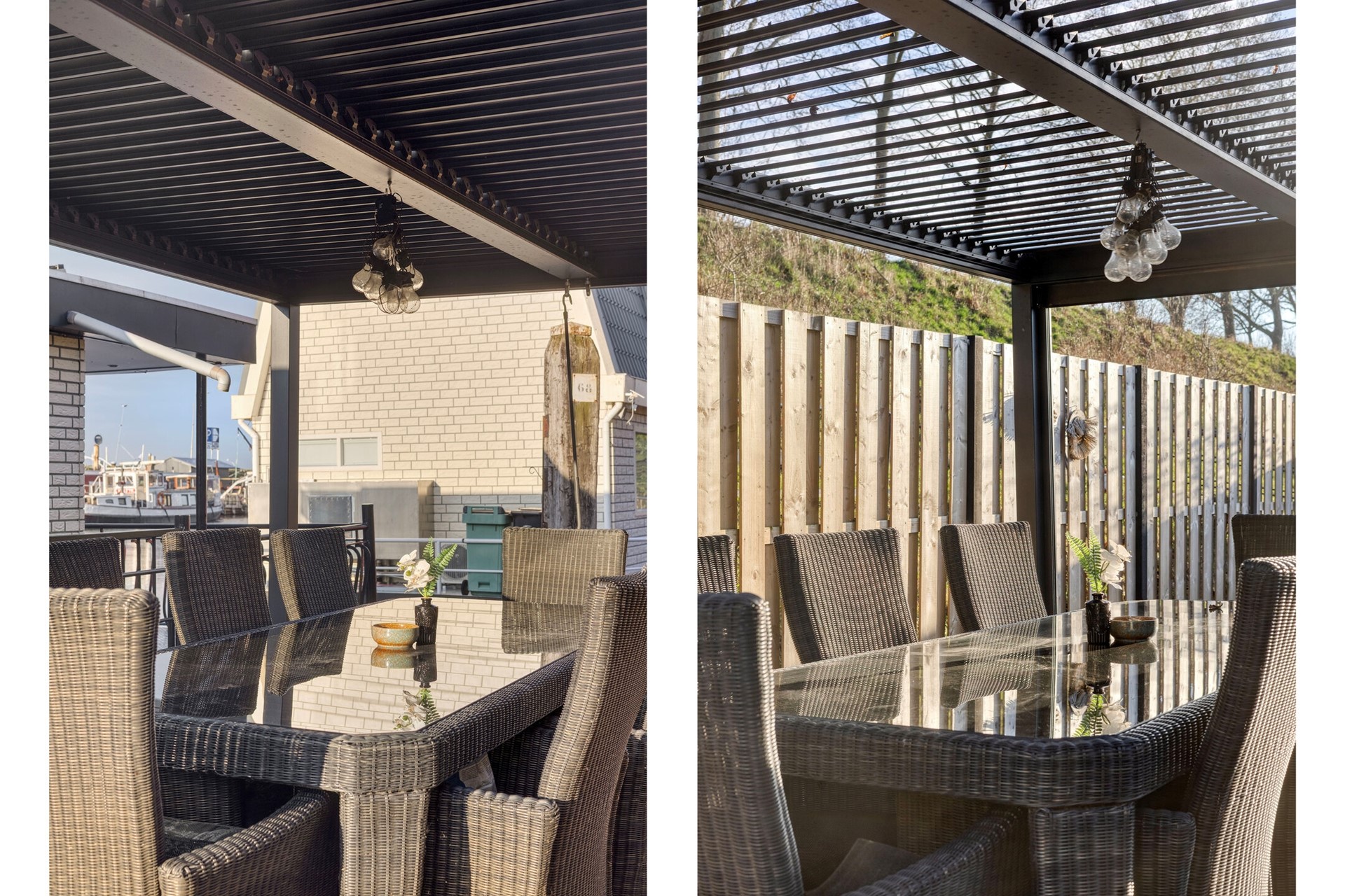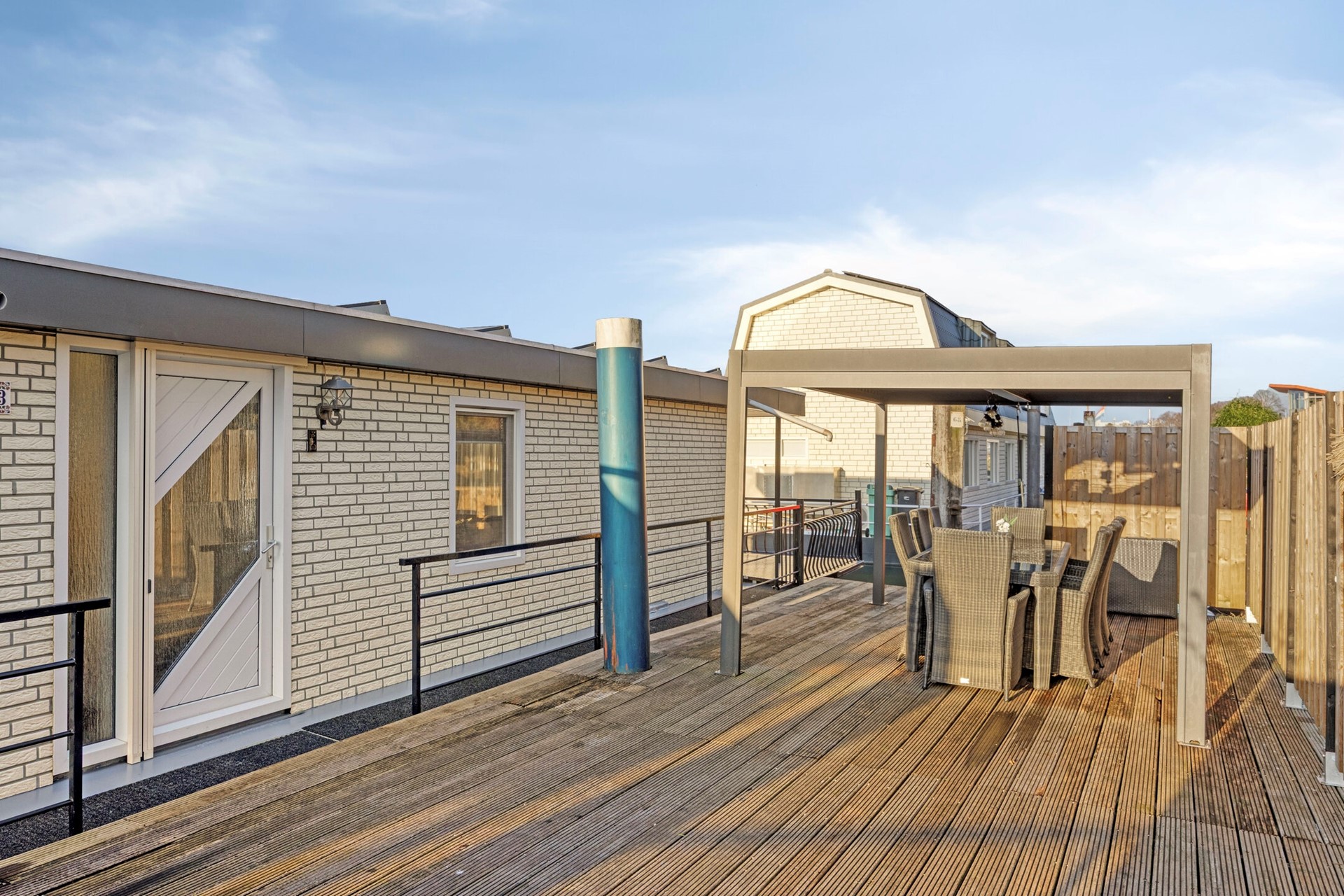 Het tweede en grotere privéterras is volledig omsloten met een schutting voor optimale privacy en beschikt over een overkapping van circa 1,5 jaar oud, waardoor u het hele jaar door comfortabel buiten kunt zitten. Daarnaast is er een afzonderlijke vlonder met tuinhuisje, ideaal voor extra opslag van fietsen, tuinmeubilair of watersportspullen.