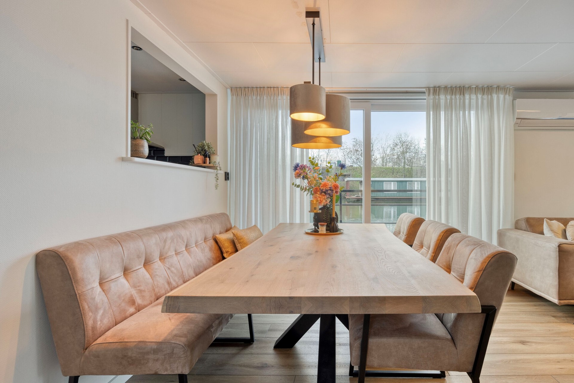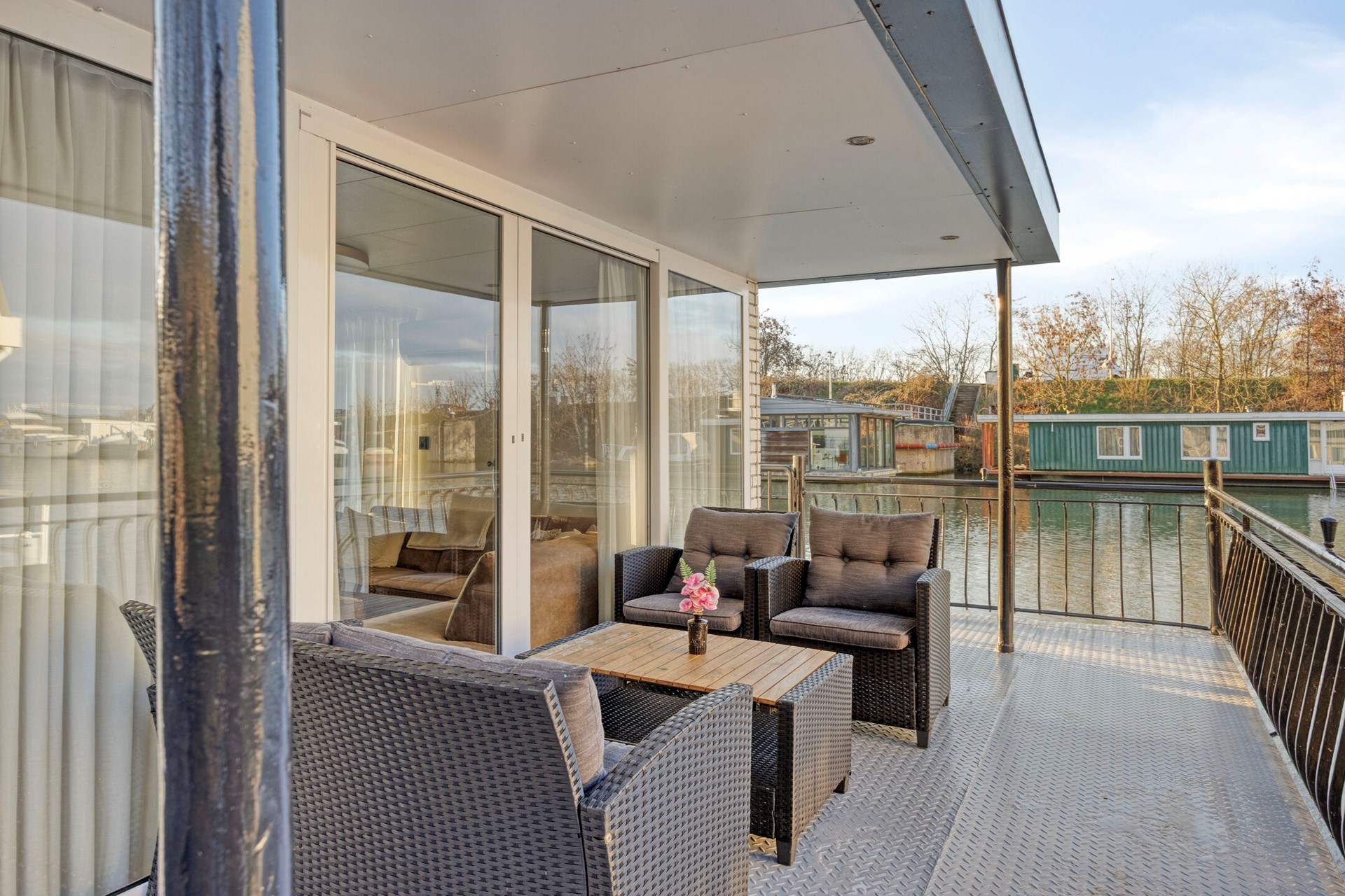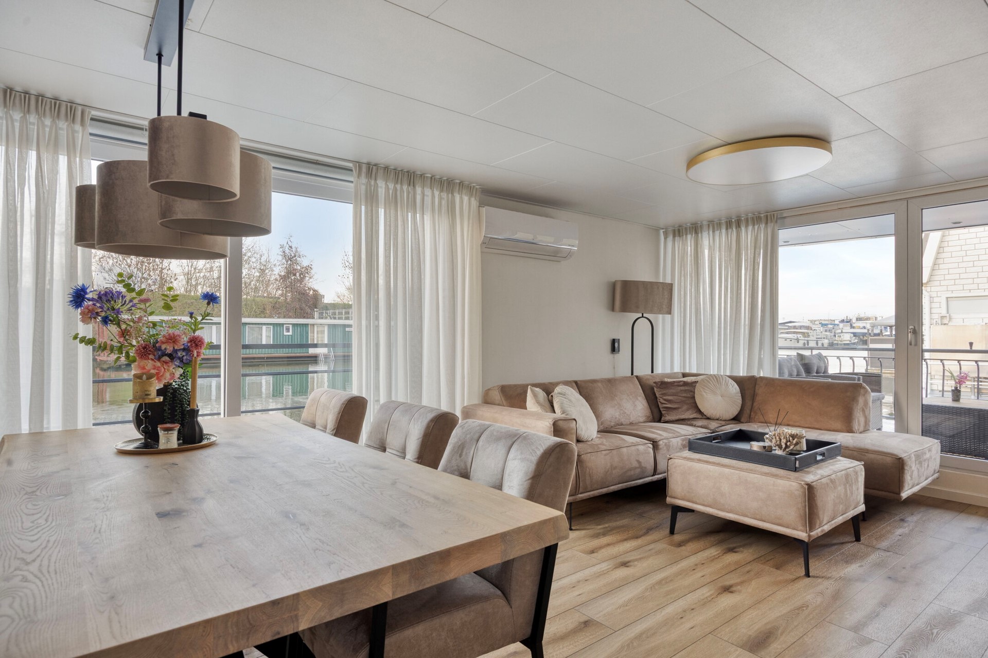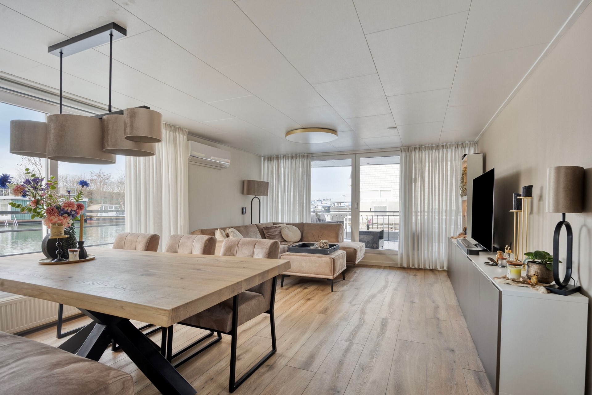 De lichte woonkamer is een heerlijke leefruimte met veel daglicht en vrij uitzicht over het water. Via de schuifdeuren, voorzien van hor, bereikt u direct het ruime privéterras met een loungezitje — dé plek om te ontspannen en te genieten van het buitenleven.