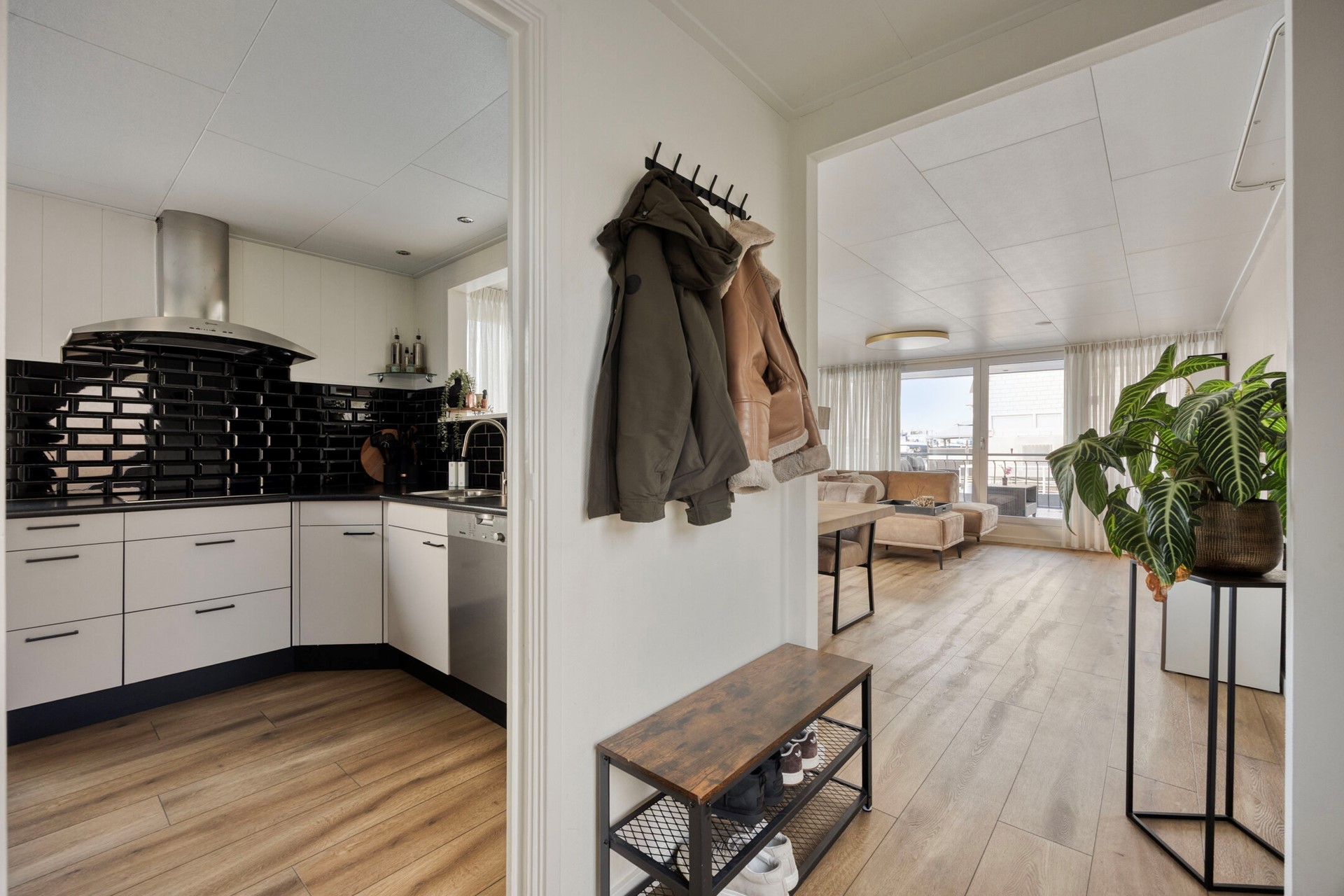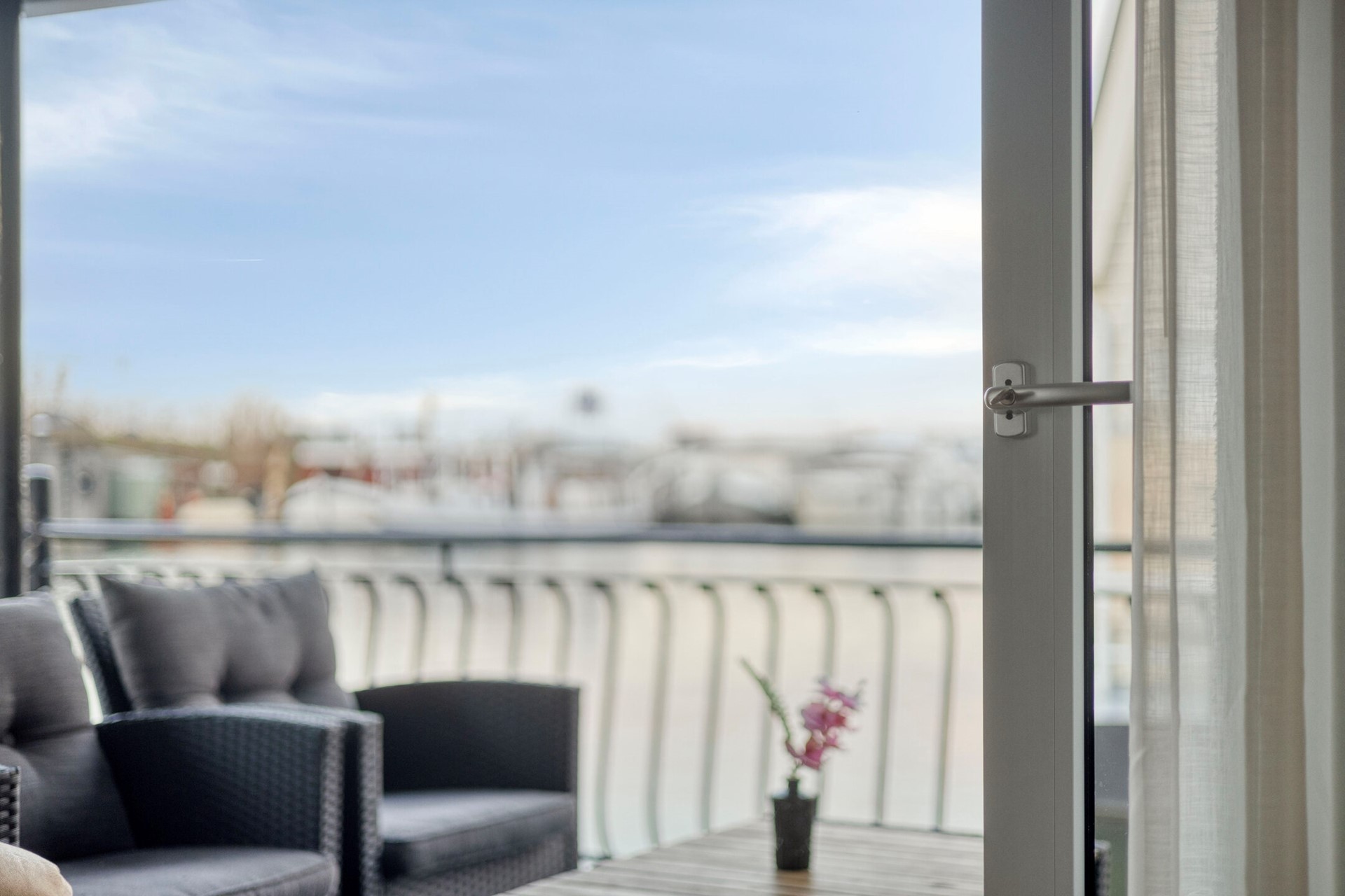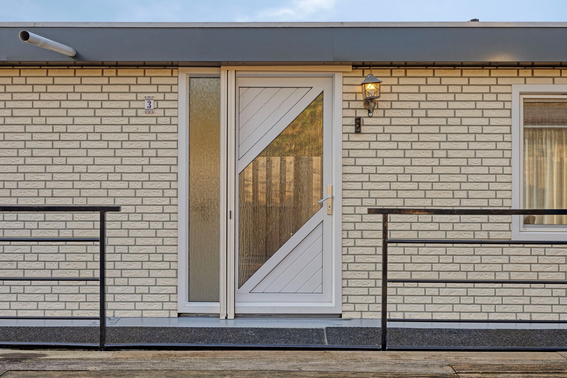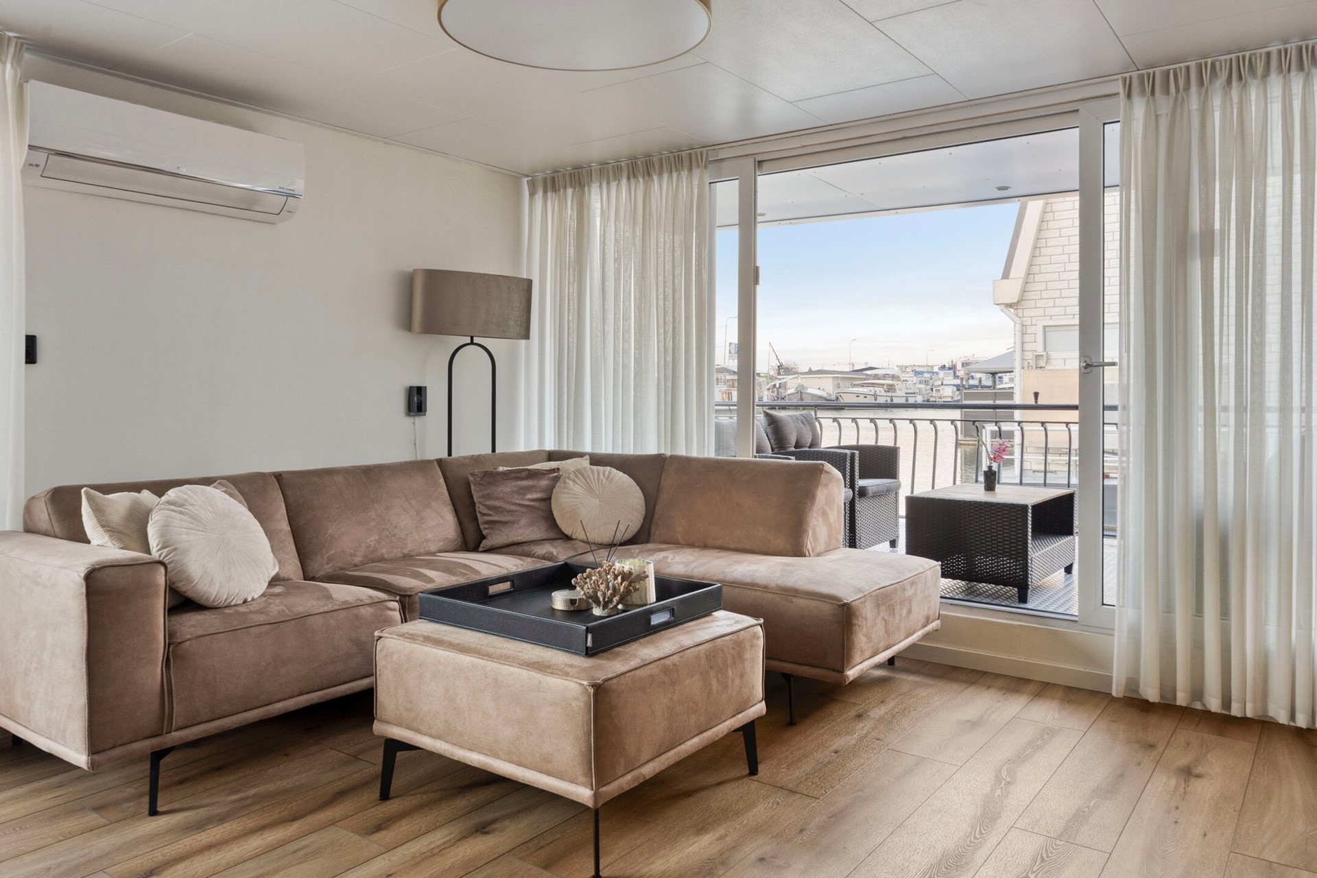 De lichte woonkamer is een heerlijke leefruimte met veel daglicht en vrij uitzicht over het water. Via de schuifdeuren, voorzien van hor, bereikt u direct het ruime privéterras met een loungezitje — dé plek om te ontspannen en te genieten van het buitenleven.