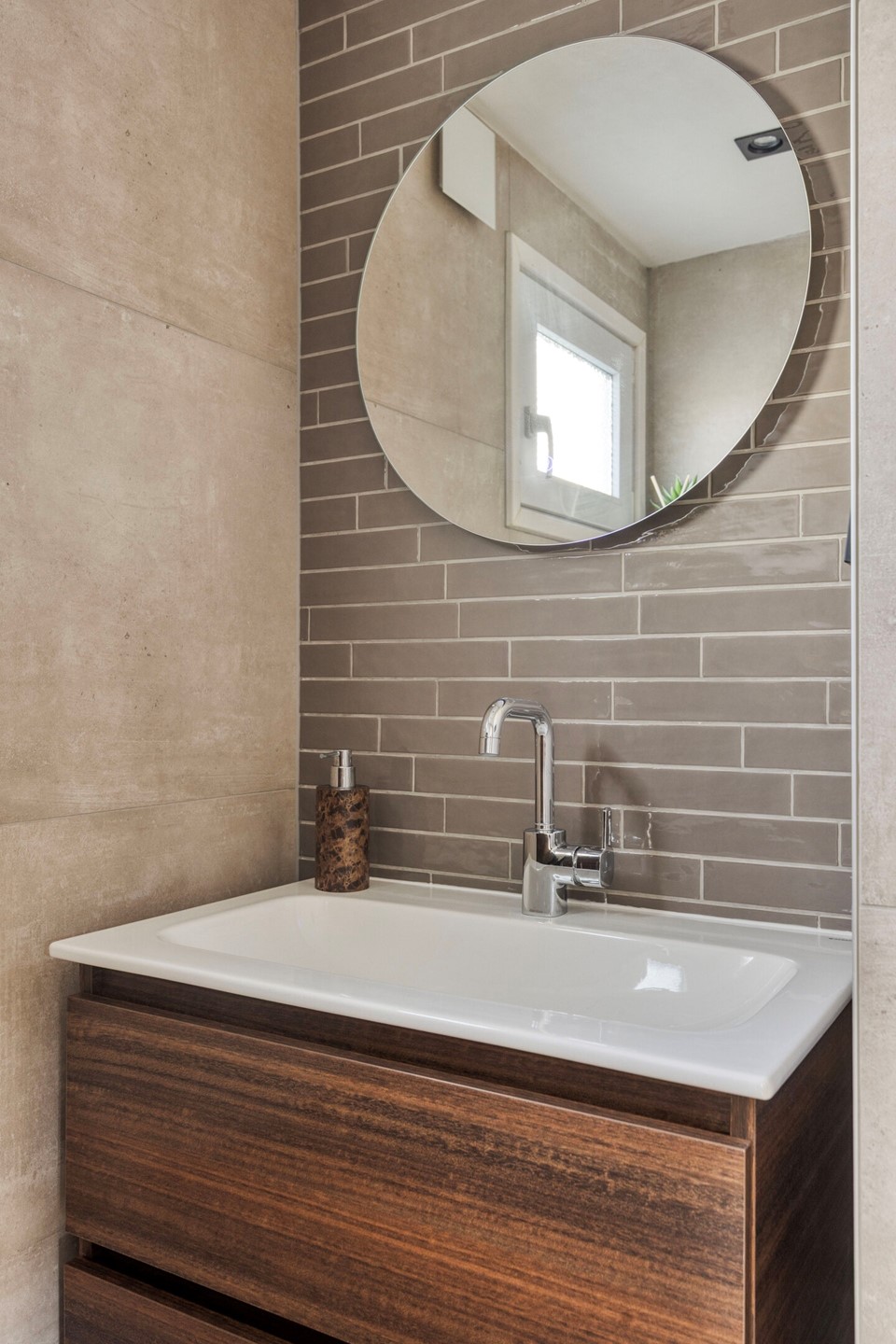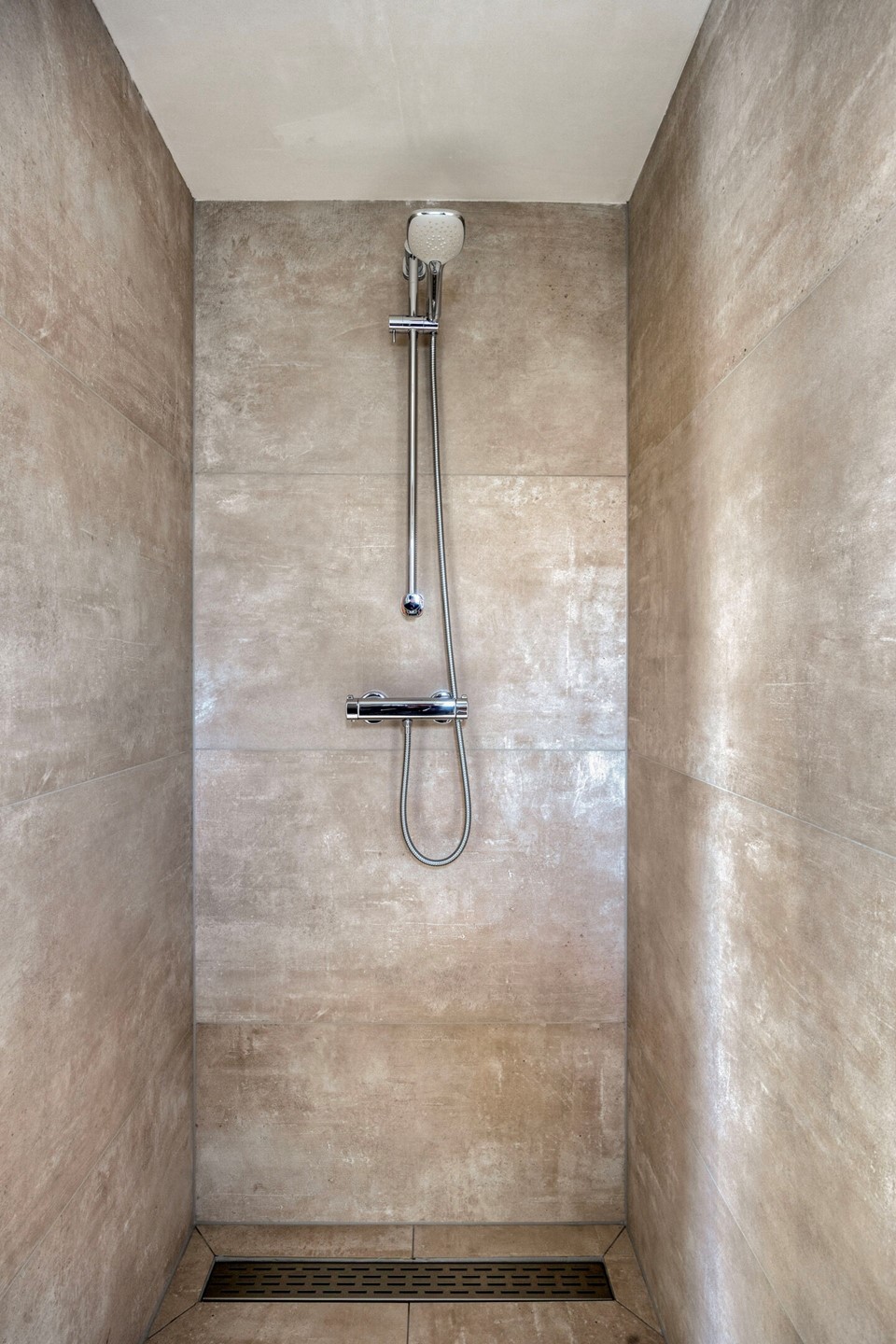 - De vernieuwde badkamer is voorzien van een inloop-douche en een wastafel met meubel;