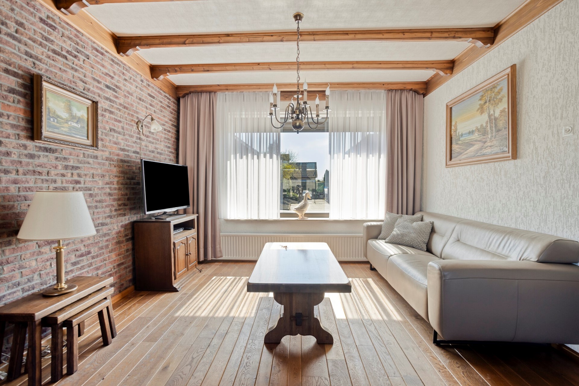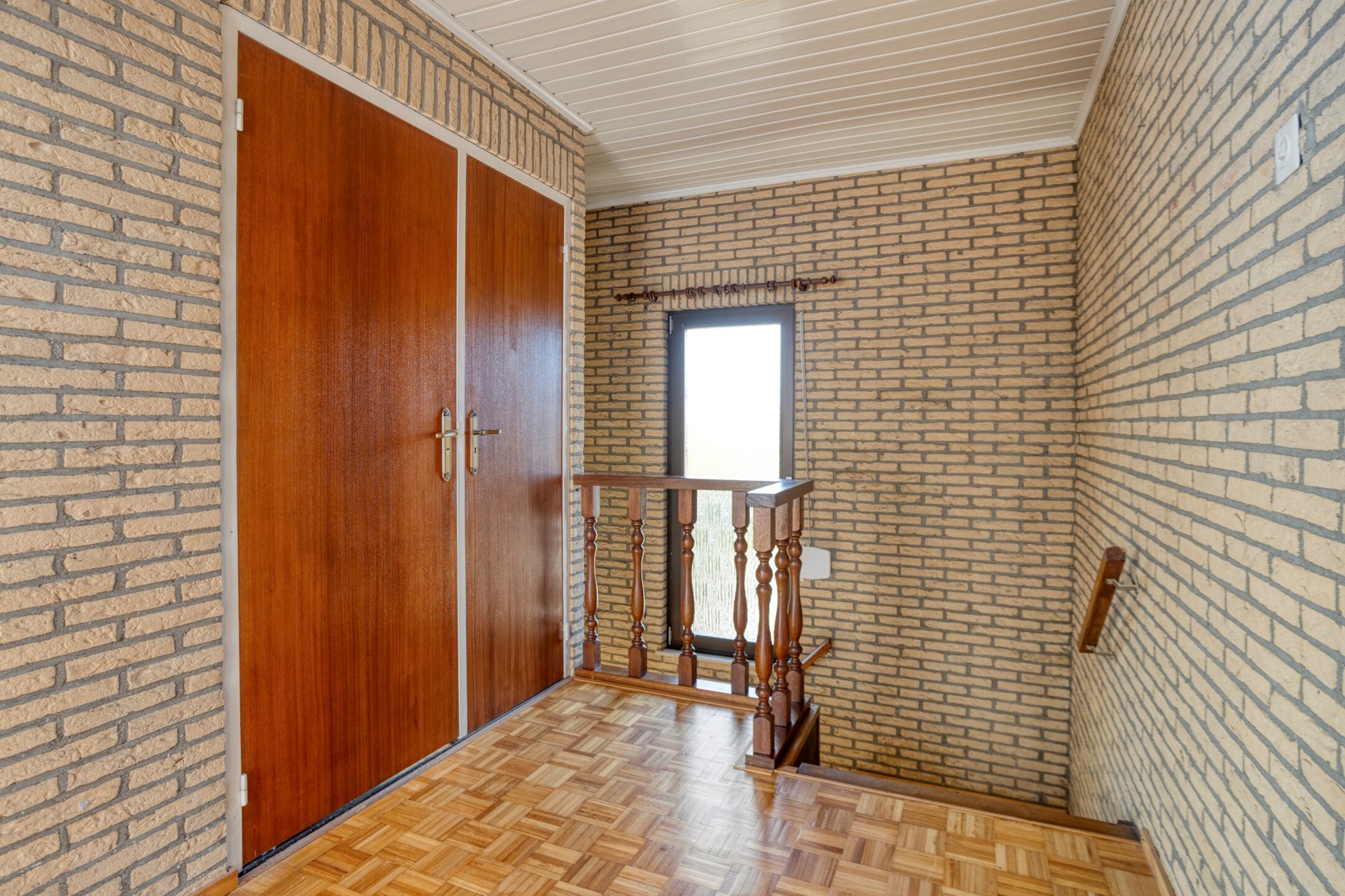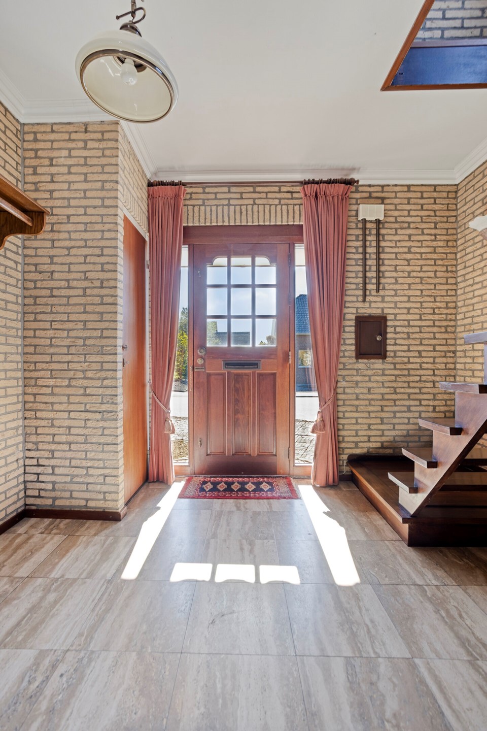 Via de ruime entree betreedt u de hal, waar zich de hardhouten trap naar de verdieping en de toegang tot het toilet bevindt. Vanuit de hal komt u in de sfeervolle woonkamer, voorzien van een houtparketvloer. Een karakteristieke gemetselde boog vormt de verbinding tussen de woonkamer en de keuken en geeft de ruimte een warme uitstraling.