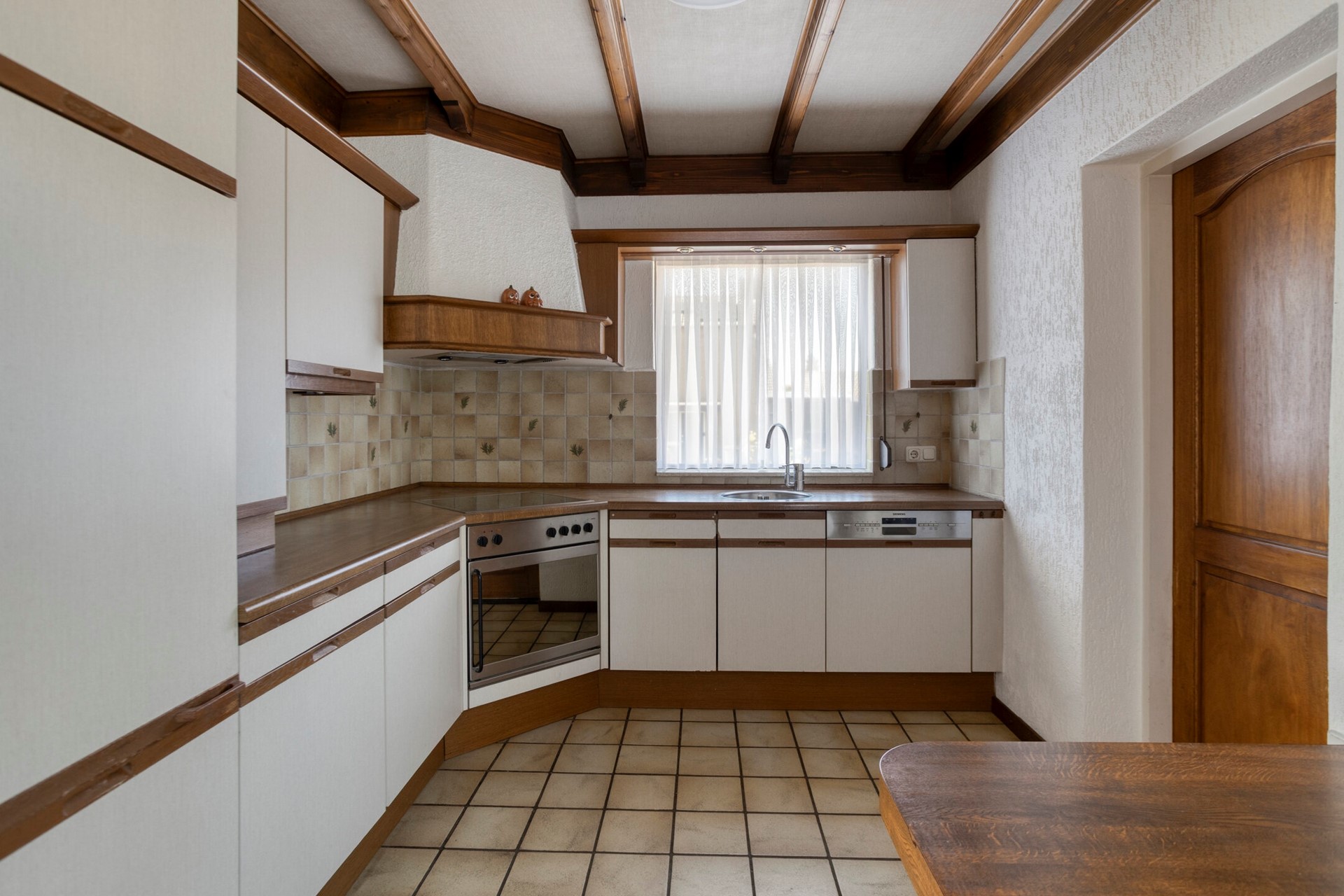 De keuken biedt toegang tot de bijkeuken, waar zich de witgoedaansluitingen bevinden. Vanuit de bijkeuken bereikt u tevens de betegelde kelder, ideaal voor provisie en extra opslag.